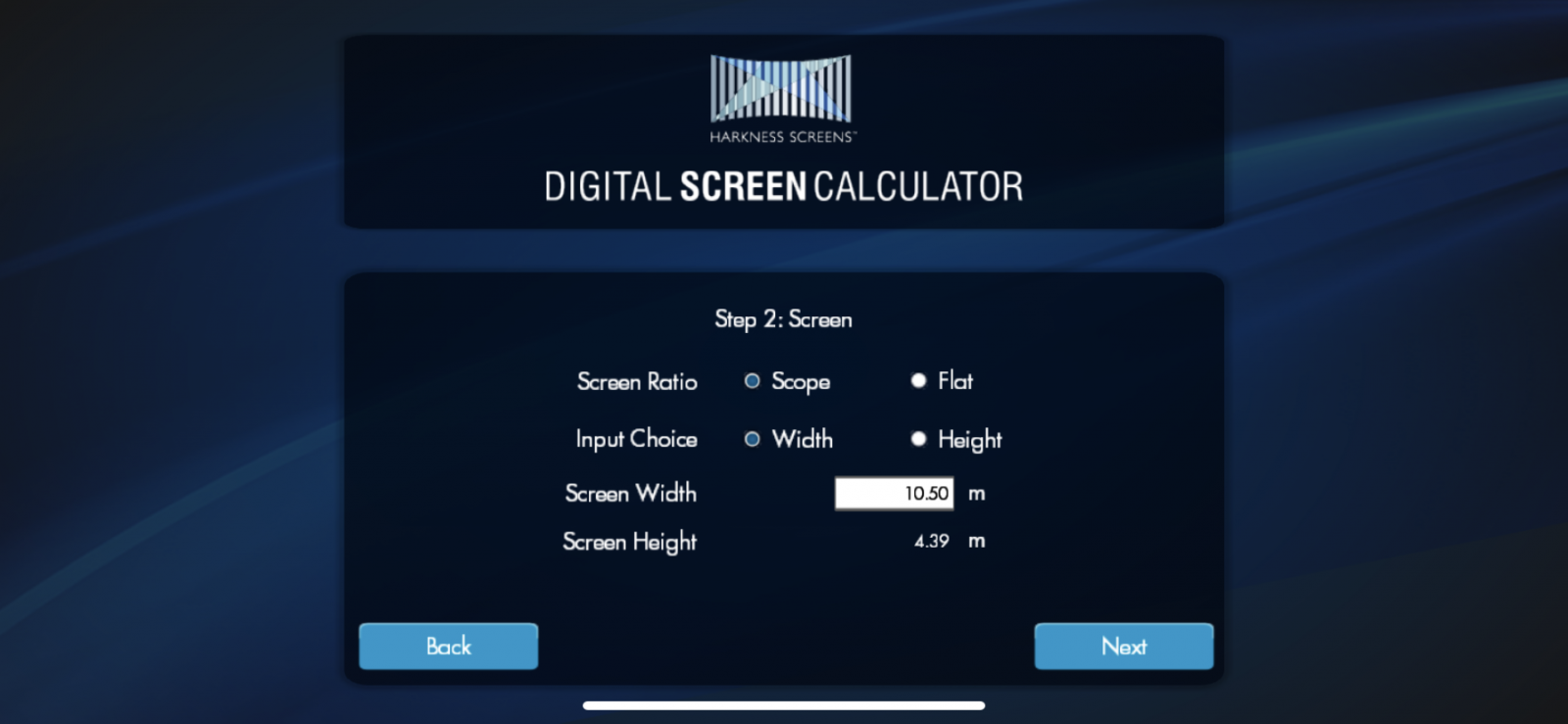 3. Параметри екрана. У розділі Screen Ratio обираємо формат екрана Scope або Flat. У розділі Input choice обираємо відомі Вам параметри екрана – або ширину Width, або висоту High. У біле поле вводимо параметри, потім обираємо Next.