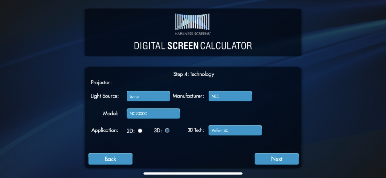 5. «Технологія». У розділі Light Source обираємо джерело світла Вашого проектора – Lamp або Laser. У бібліотеках Manufacture та Model відповідно оберіть виробника та модель проектора. У розділі Application зазначте, чи застосовуєте Ви 3D з проектором, якщо так – в бібліотеці 3D Tech обираємо виробника і модель 3D-системи, потім – Next.