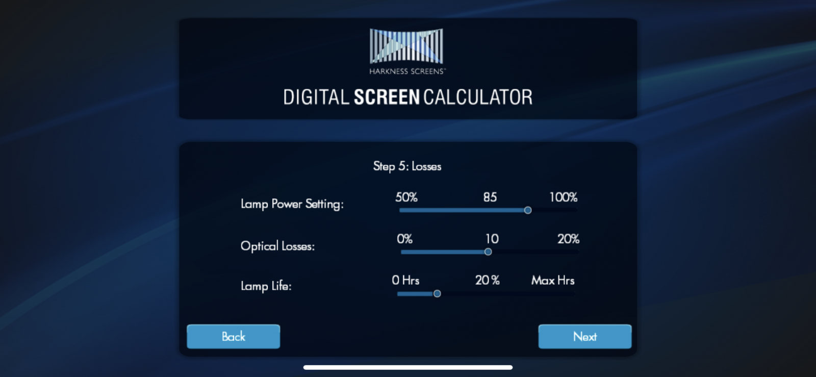 6. «Втрати». У цьому розділі наводяться параметри та умови роботи проектора, а саме Lamp Power Setting – потужність лампи у відсотках. Зазвичай, лампи працюють на 80-90% від своєї максимальної потужності. Optical Losses – оптичні втрати, пов’язані з використанням проекційного вікна та віддаленістю від екрана (зазвичай, ? встановлюється на рівні 10%). Lamp Life – як відомо, лампа на початку свого ресурсу є більш яскравою, ніж наприкінці, тому для оптимального розрахунку потрібно вказувати напрацювання не менше ніж 15-20%, потім – Next.