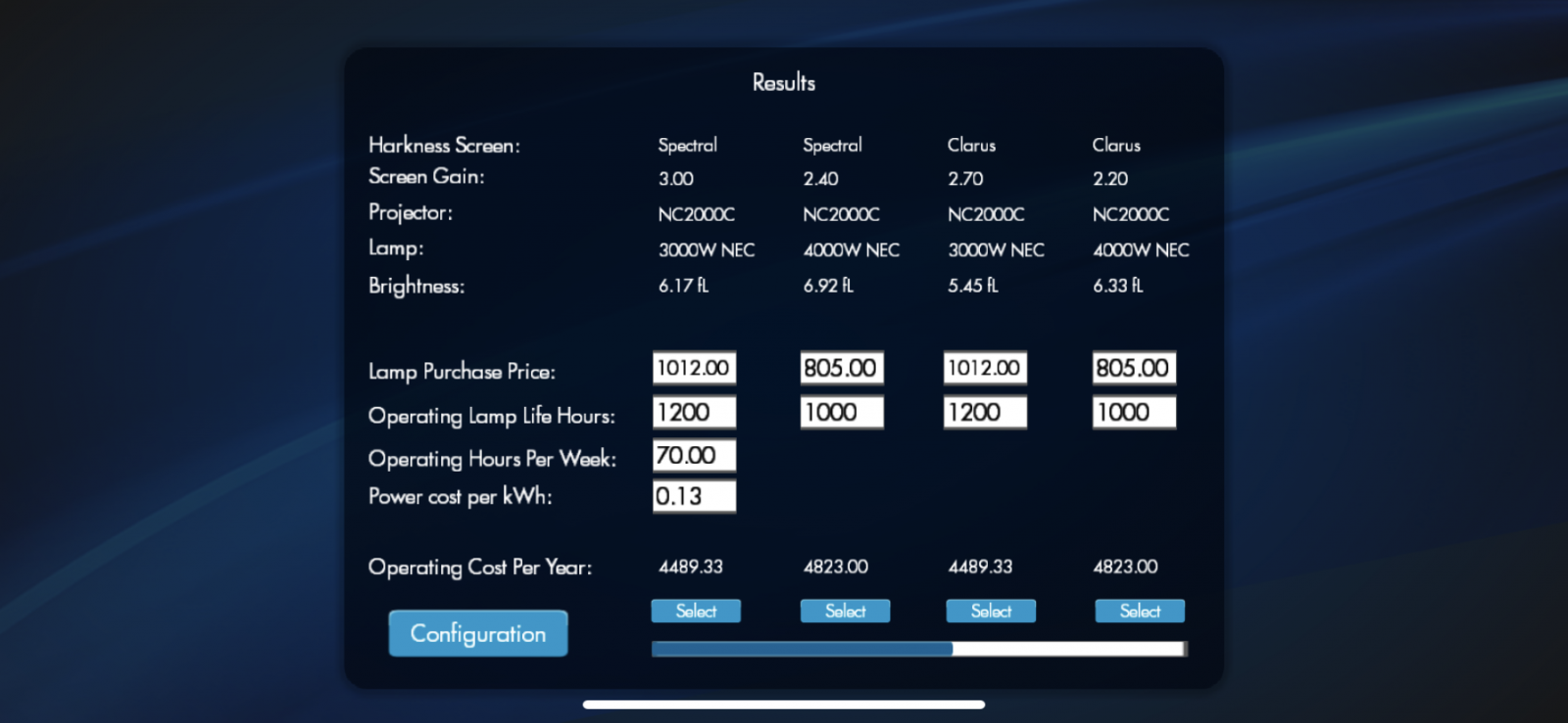 9. «Результати». На останній сторінці можна побачити тип полотна екрана, яке рекомендоване для Вашого обладнання і яке відповідатиме усім наведеним Вами параметрам, моделі проектора та моделі й потужності лампи, а також яскравості, яку Ви отримаєте при експлуатації обладнання. Окрім цього, можна одержати інформацію щодо експлуатаційних витрат у зазначеній Вами валюті.